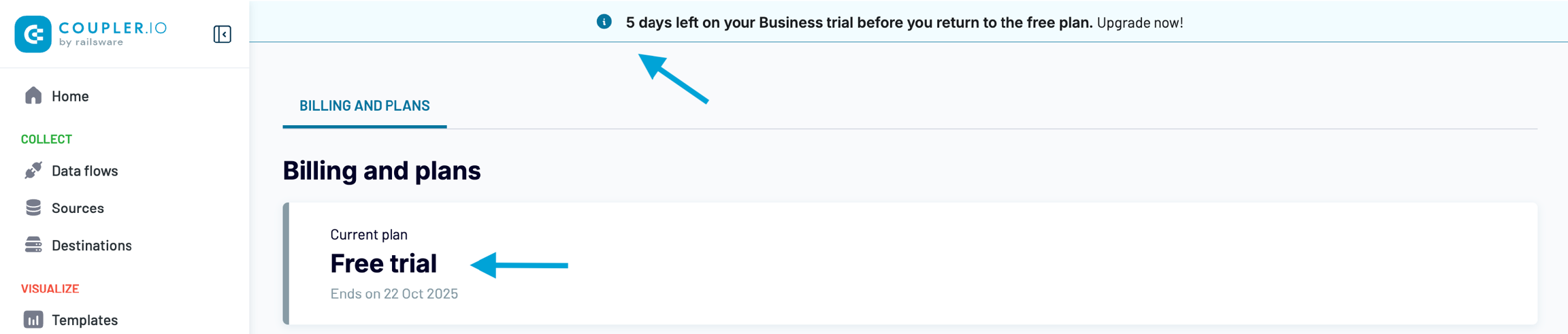 Once you sign up to Coupler.io, a free 7-day trial of the Business plan is enabled for you by default.