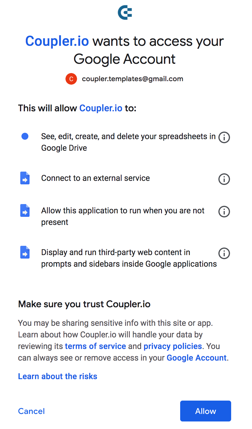 Why does Coupler.io add-on ask permission to access my Google Account?