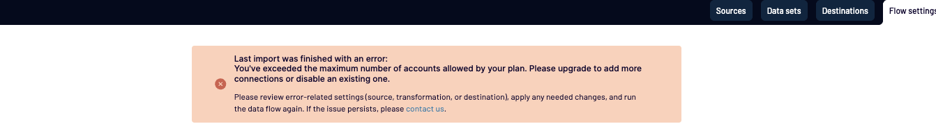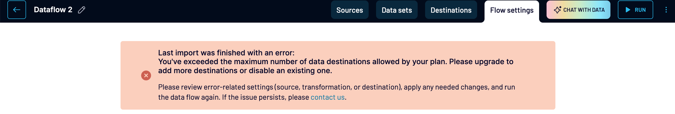 To continue running your data flows, you will need to update the destination so you're within your current plan's data destination limit, or upgrade to a plan with more data destination limit as needed.