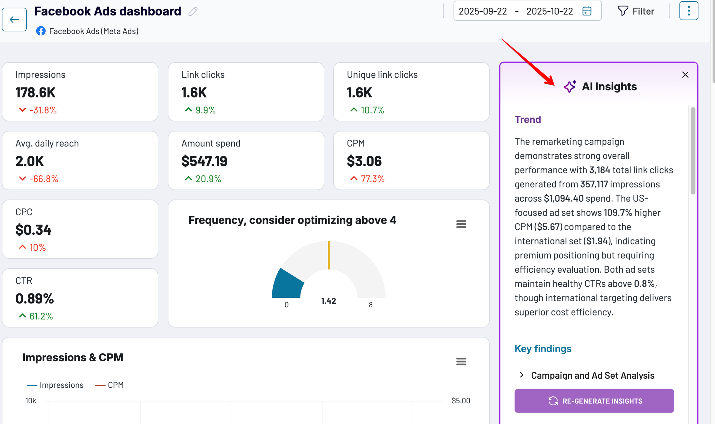 Clicking the AI Insights button for the first time (or the Re-generate Insights button for previously generated insights) counts as one AI insight.