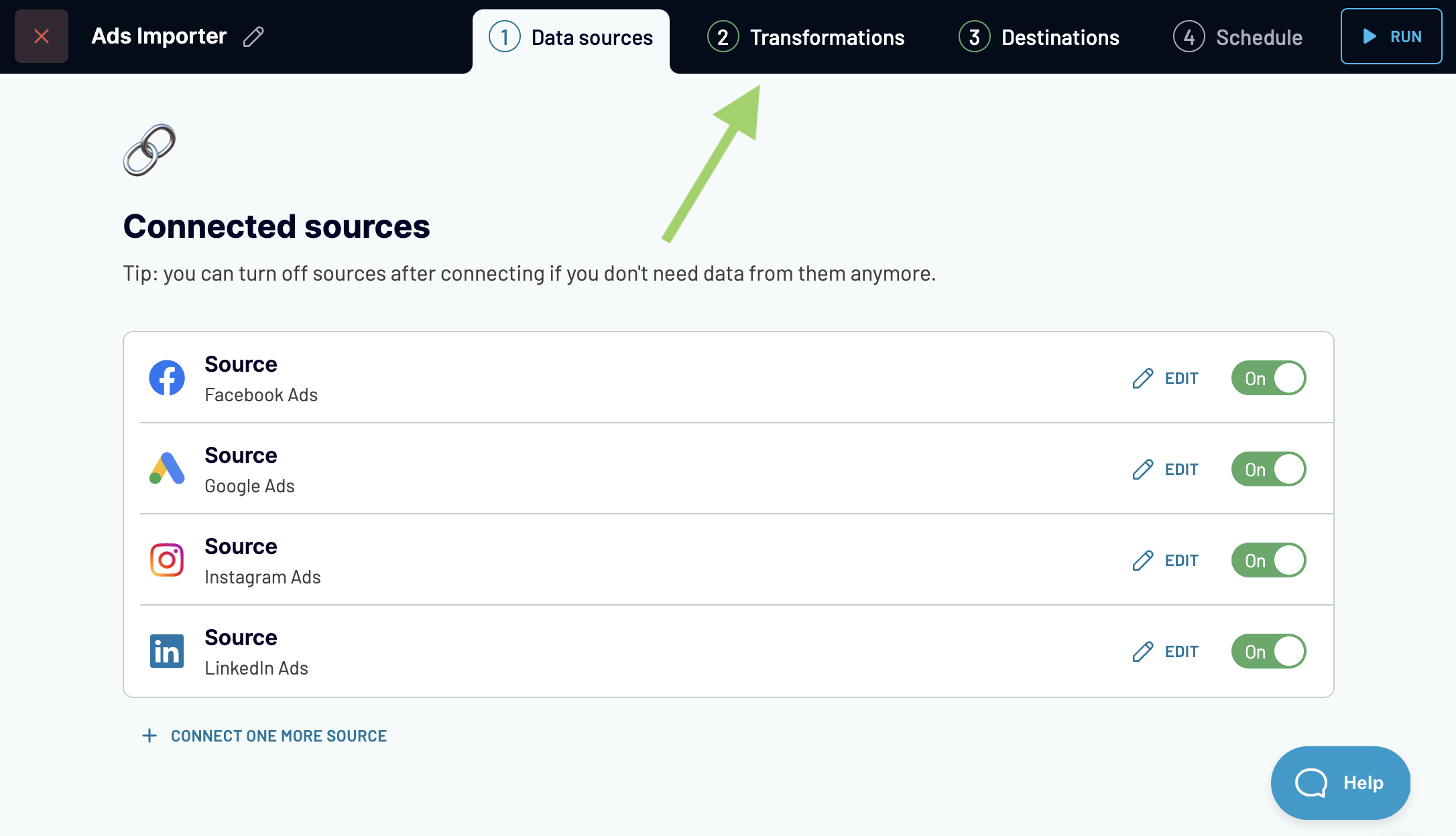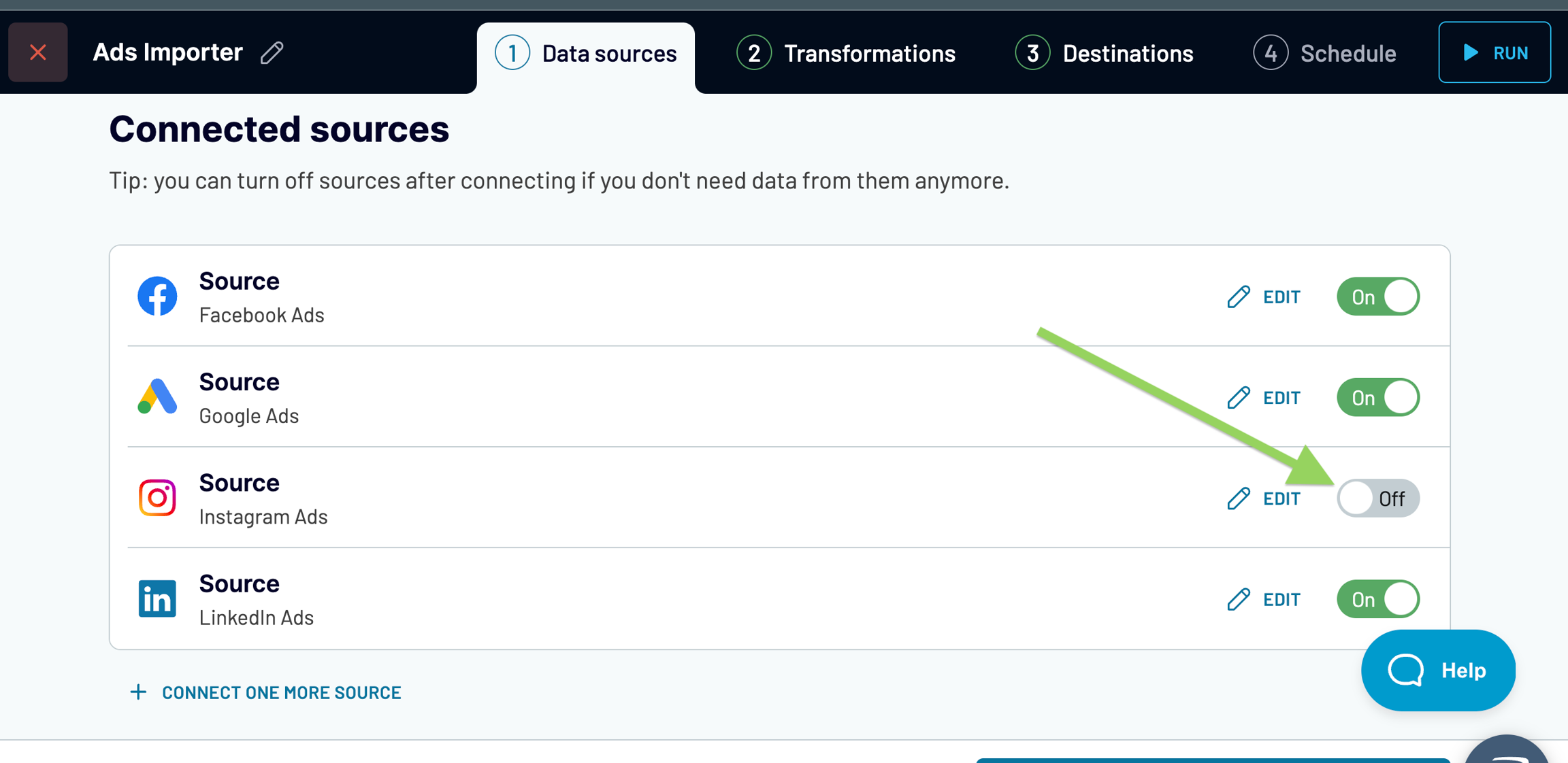 This action preserves the source's settings but removes data from this source on Transformations (and it won't be imported to the destination accordingly). If you enable the source back on, the data will appear on Transformations again.