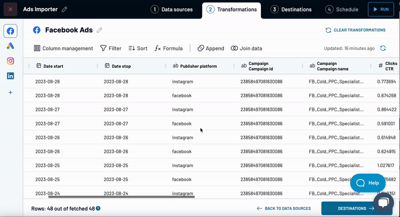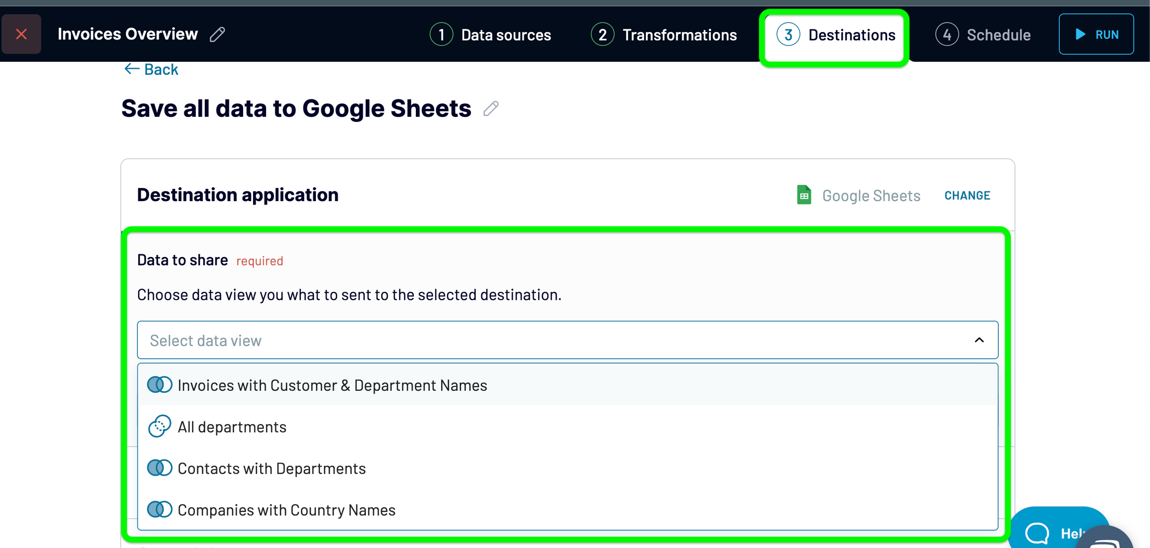 5. After adding all the needed transformations, proceed to the "Destinations" step. Choose the data view for import into the destination, and set up the remaining destination parameters.