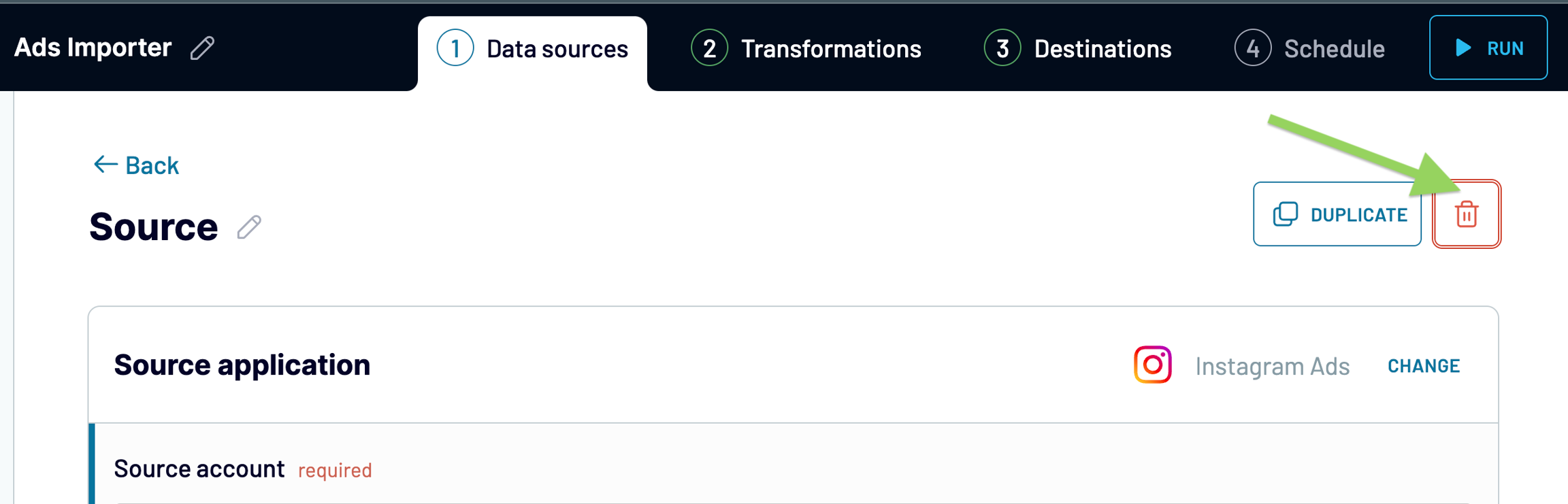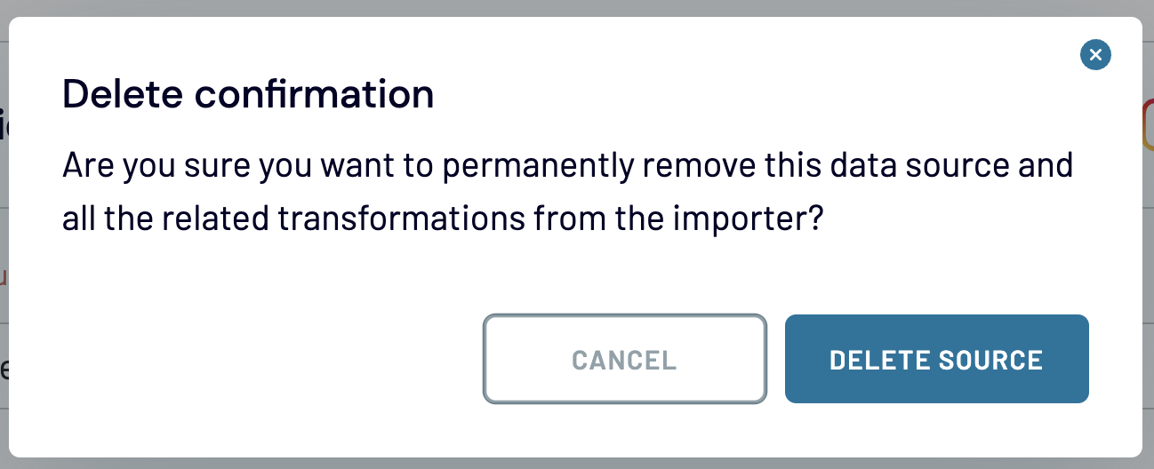 ⚠️ This action will remove your source with all its settings from the importer completely. It will also remove all the transformations in your importer associated with this source.