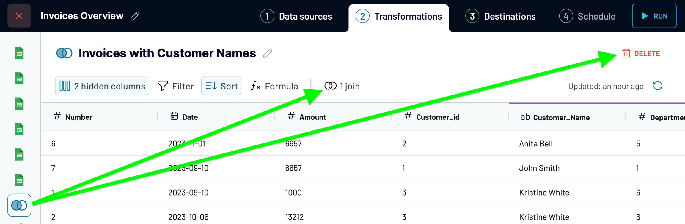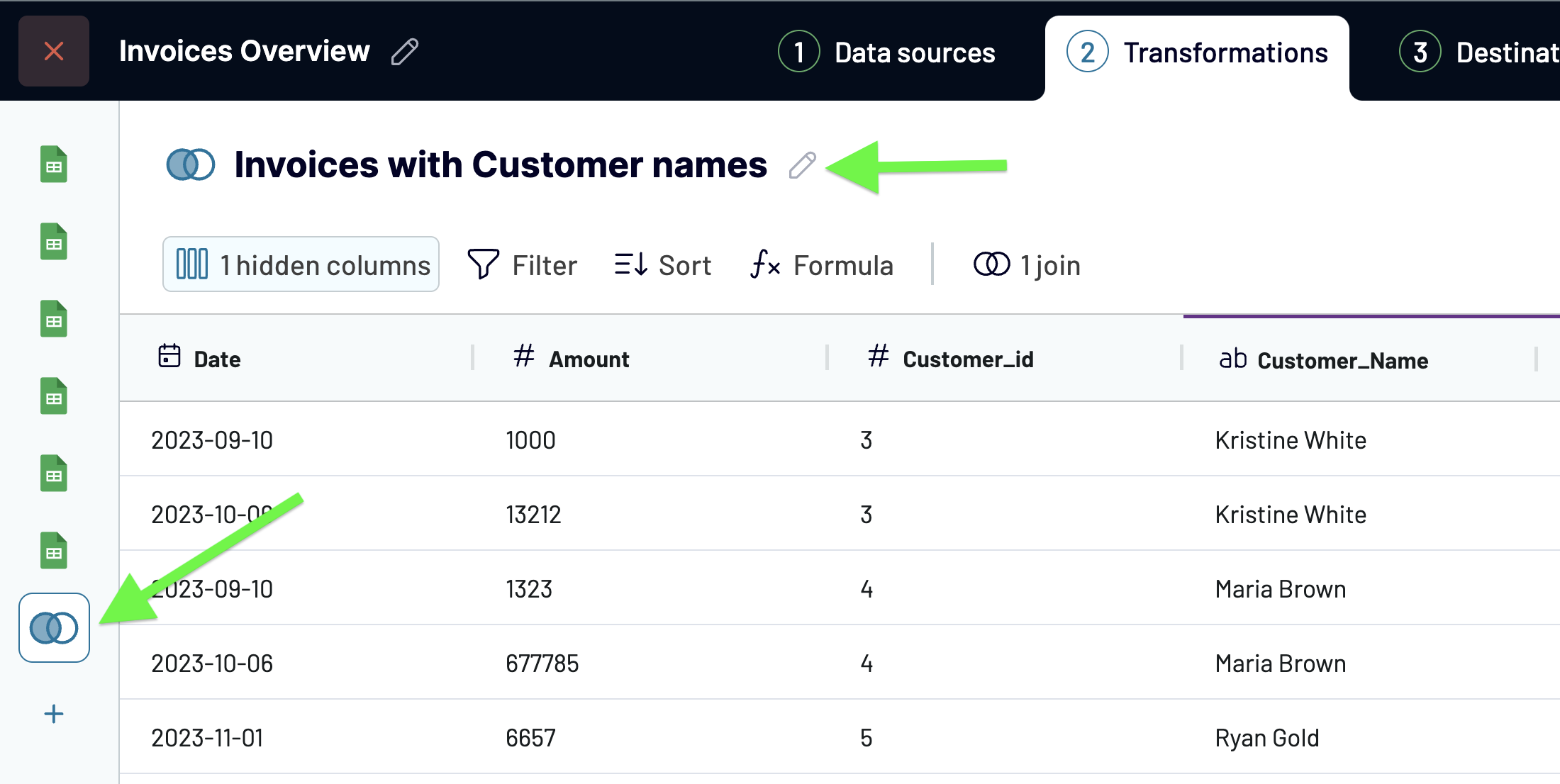 Now that you've added the transformation, it appears as a separate dataset view on the left menu. Select it from the menu to preview the results of the combined data. Same as with sources, you can give your transformation view a unique name: