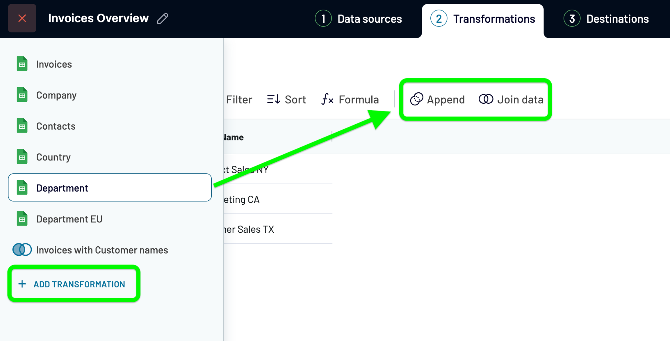 3. To add another transformation, pick the next source where you want to combine data >> pick Append/Join on preview, or choose "+ Add transformation" from the left menu: