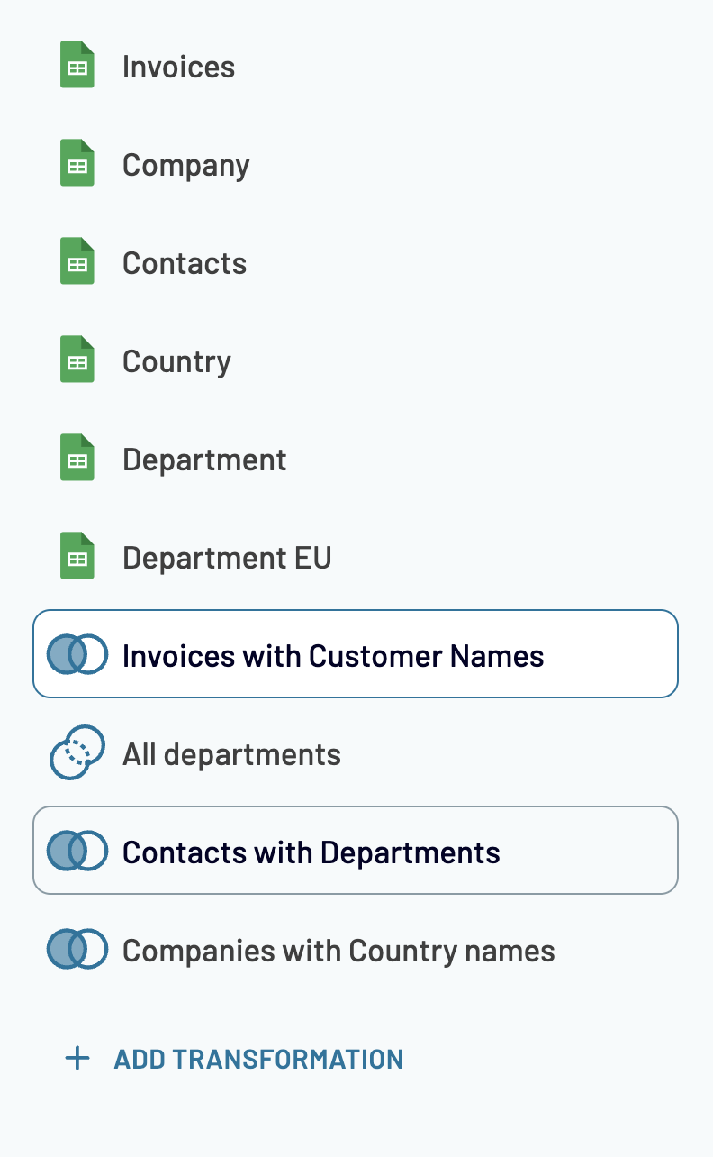 2. Add your first transformation by selecting the data combining mode from the preview, or by hitting "+ Add transformation" option from the left menu: