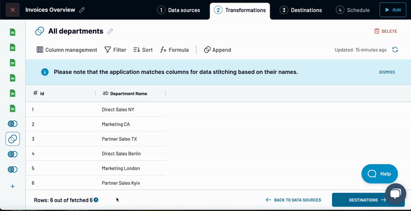 - two sources with departments that we merged to "All departments" Append view;