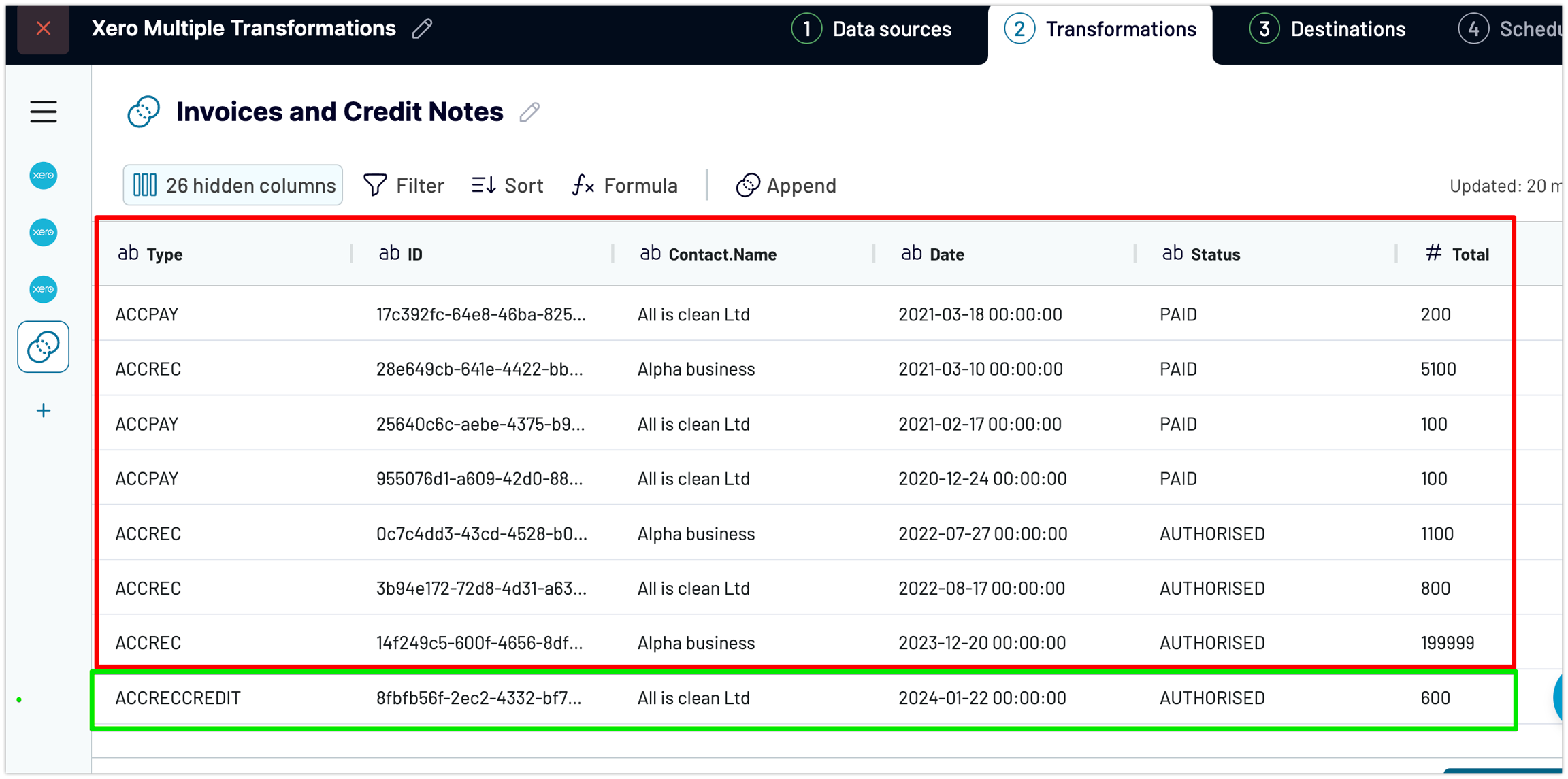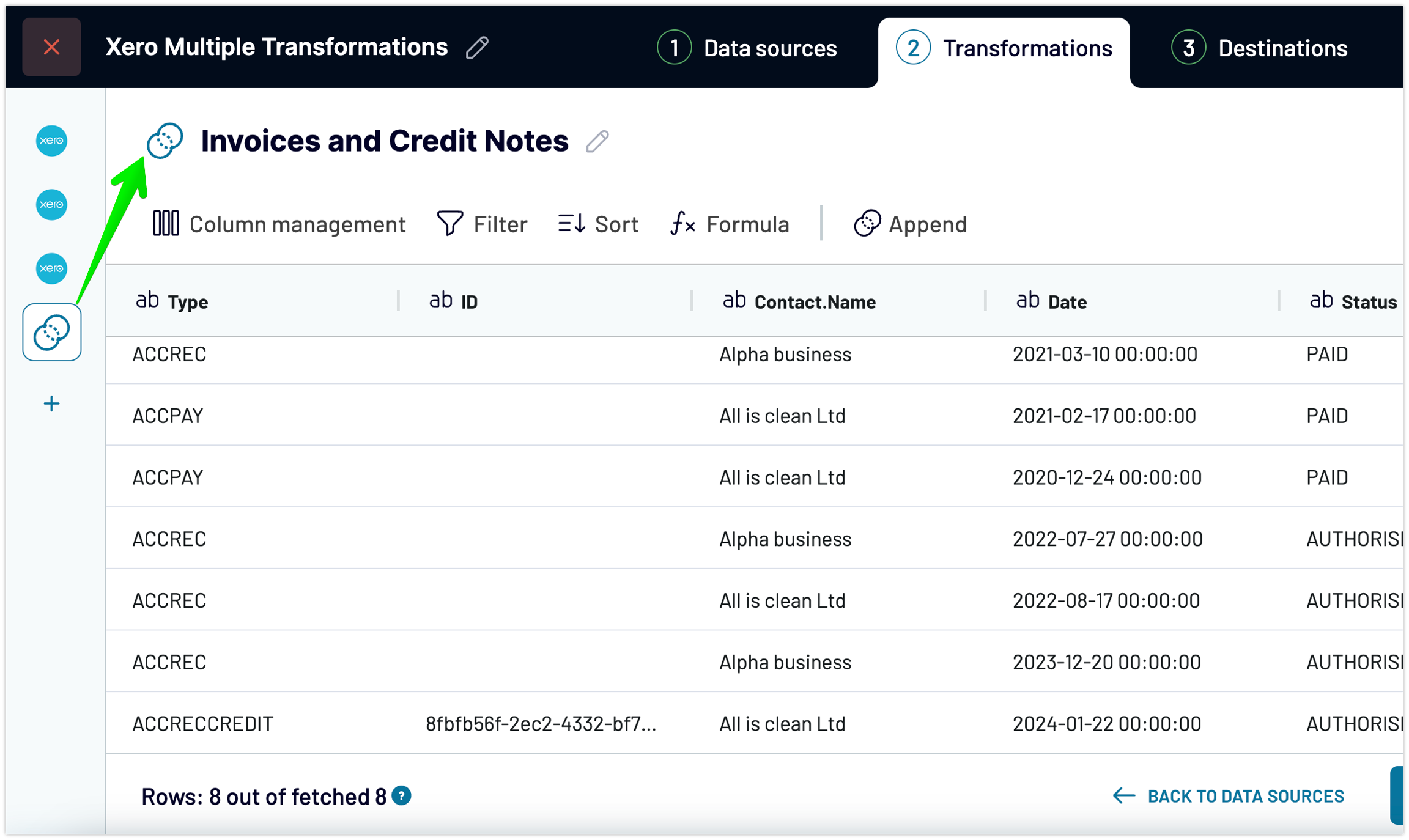 rename columns to match in both sources ( e.g. column "CreditNoteID" in Credit Notes source, and "InvoiceID" in Invoices source we rename to just "ID" in both sources, so we get aligned data under the same column in our Append view)