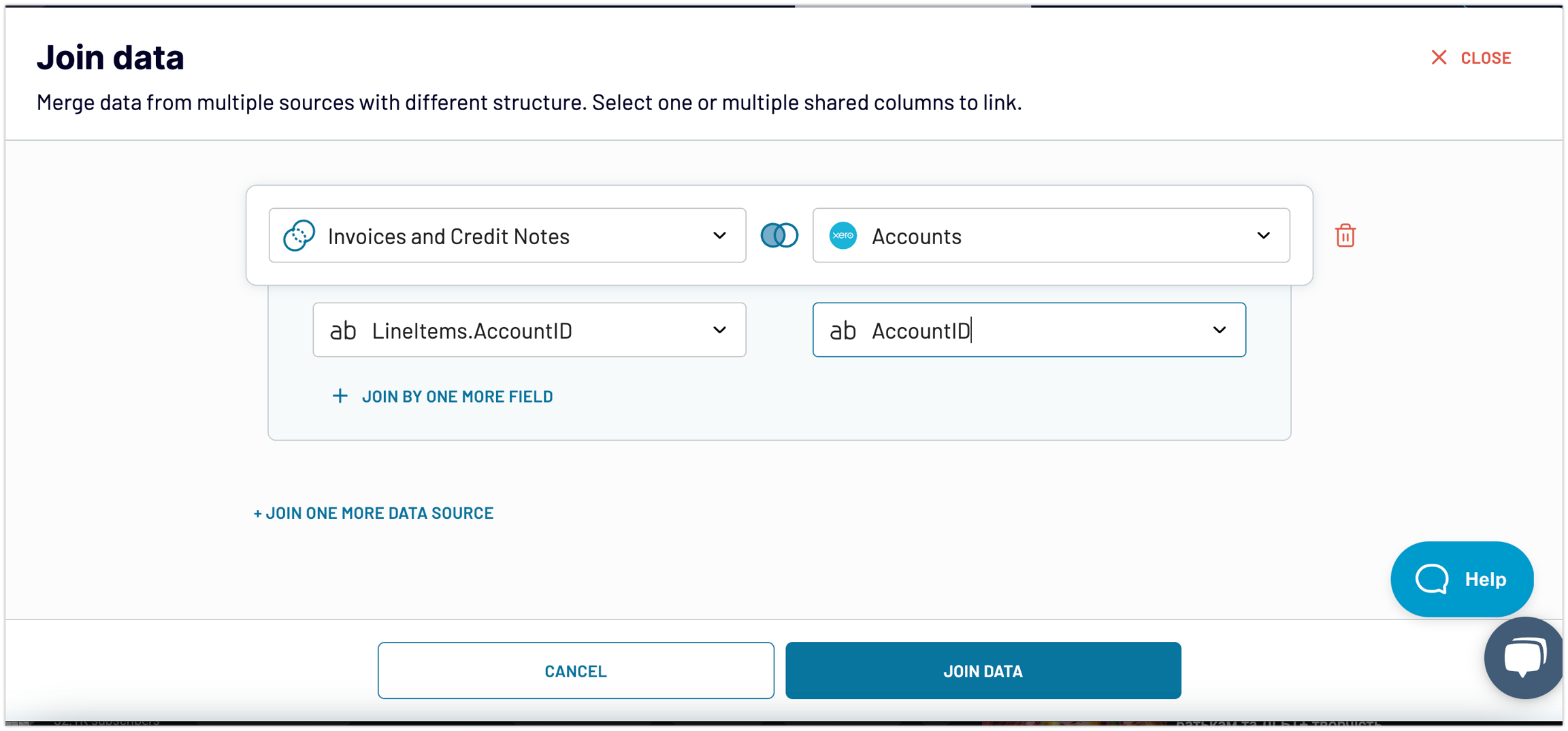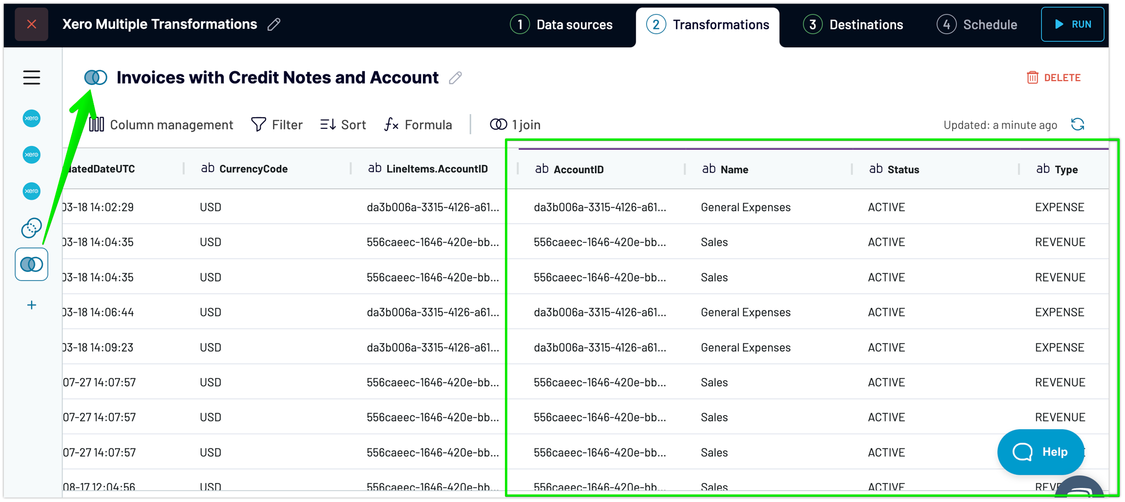 hit "+Add transformation" in the left panel >> choose "Join" >> join our existing "Invoices and Credit Notes" View with "AccountID" source by the key columns "LineItems.AccountID" and "AccountID" accordingly >> press "Join data":