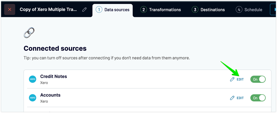 3. In the duplicated source, change the data entity to Credit Notes. Add another source for Accounts with the same steps, and proceed to the Tranformations:
