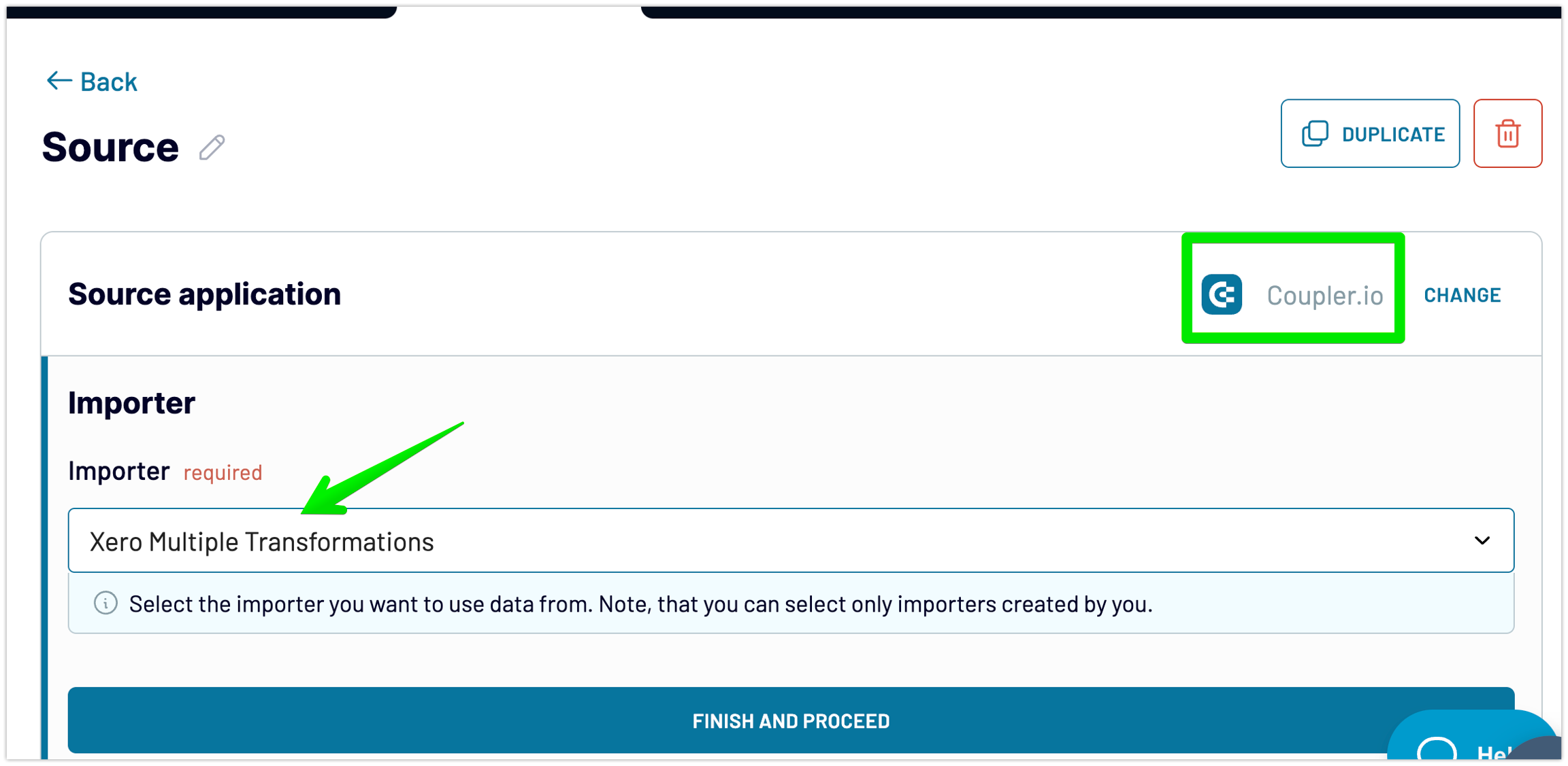 Select Coupler.io as your source, and choose the previous importer: