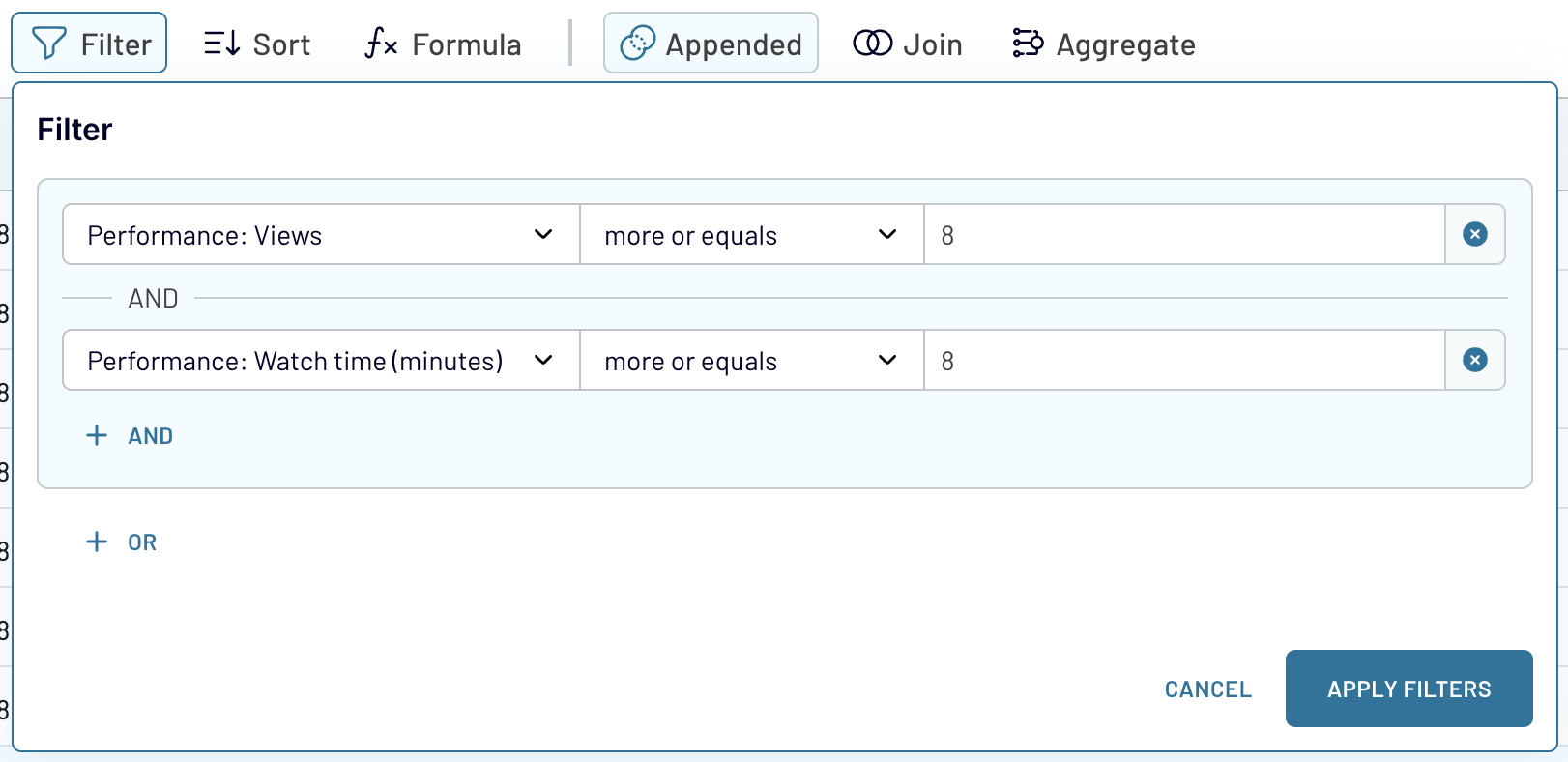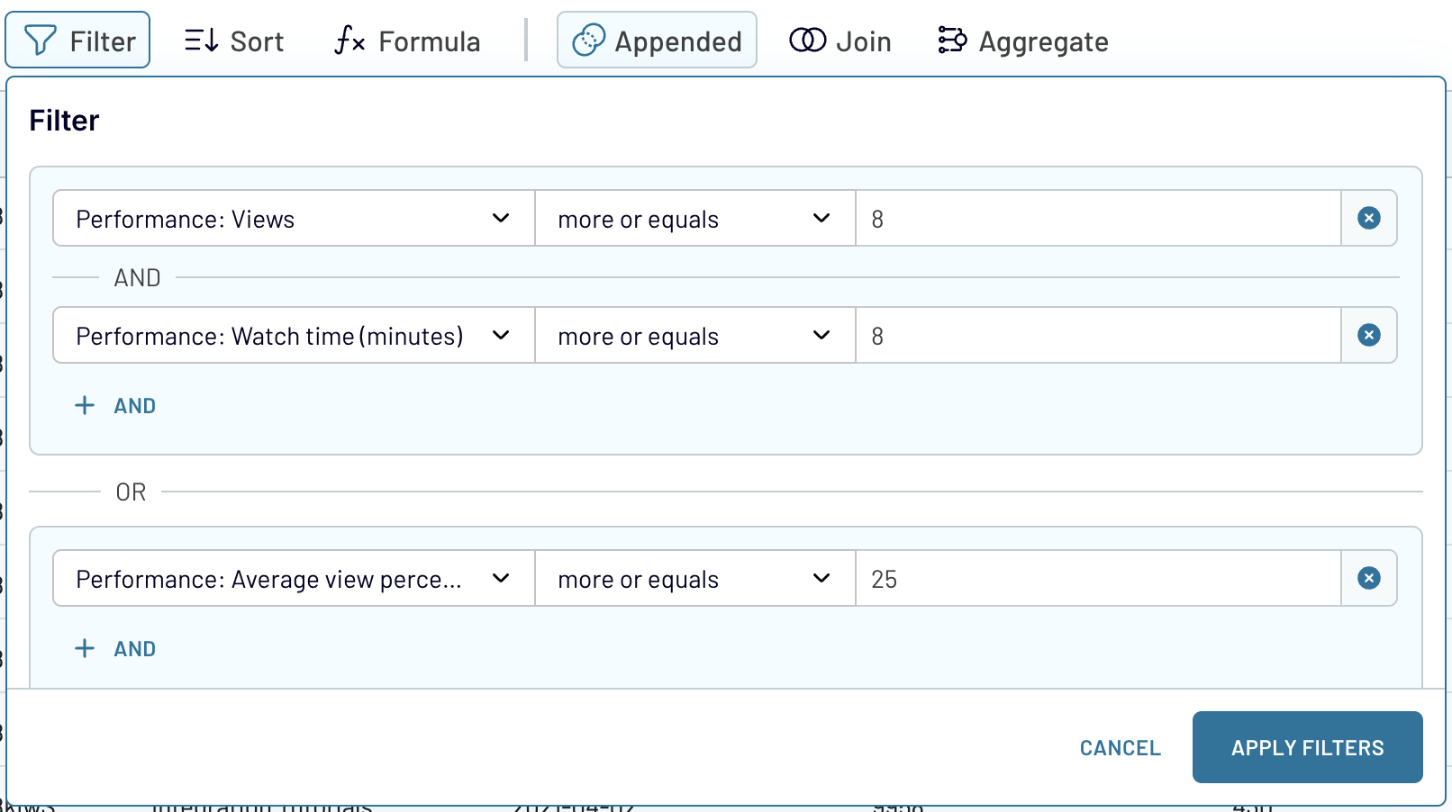 For example, we want to fetch videos with more than a certain number of views and a larger than given watch time, then our filter should look something like this: