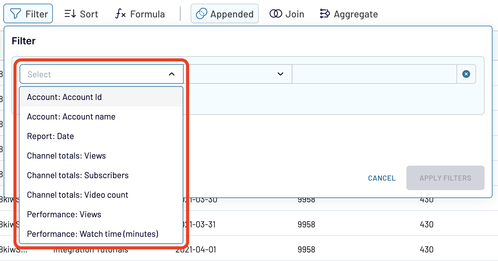 2. Click the first dropdown box and select any of the columns you wish to filter