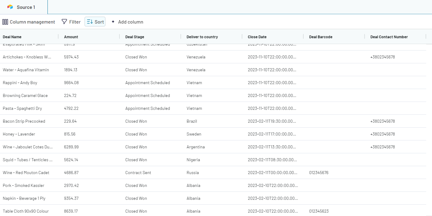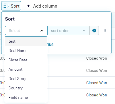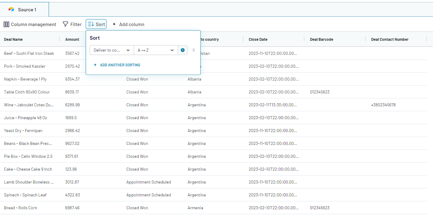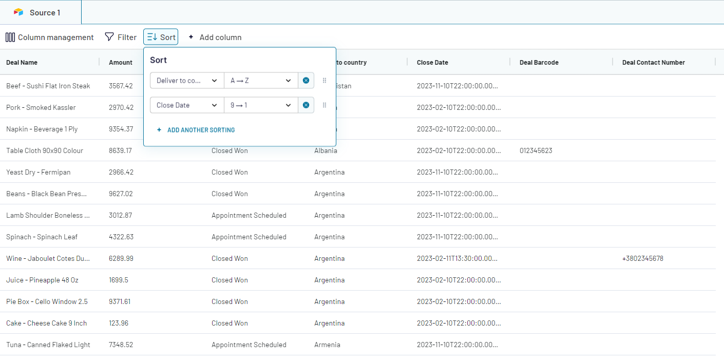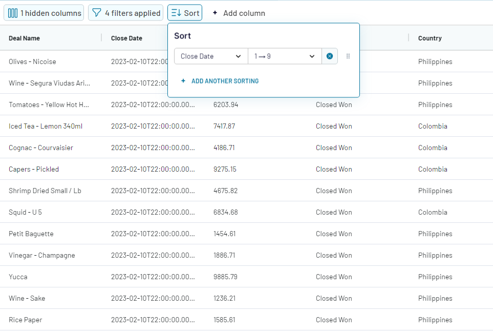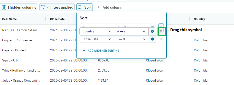 If we move the positions of the sorting criteria ("Close Date" criteria above "Deliver to country" criteria). Then, the priority of the sorting will change. The data will be sorted by close date first, before it will be sorted on the country where it will be delivered: