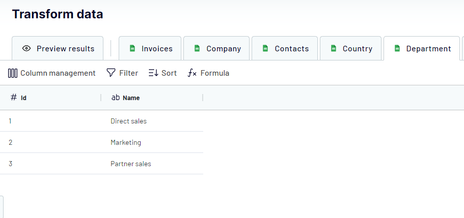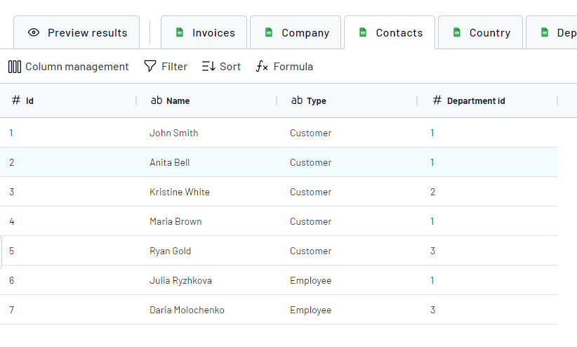 Goal: We want to get a list of "Contacts" under the "Partner sales" department. Currently, the "Contacts" table only has the IDs.