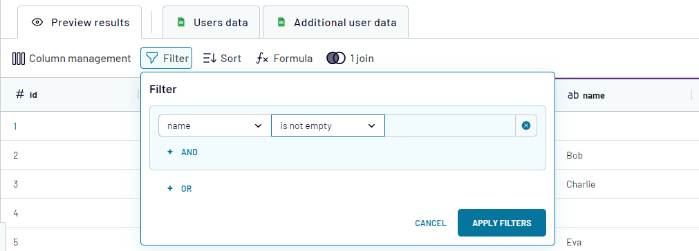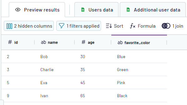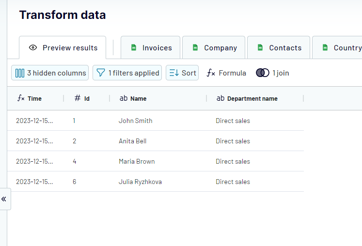 4. After joining the data, you can apply other transformations such as: hide and reorder columns, filter and sort data, add a formula column, etc. to achieve the desired result: