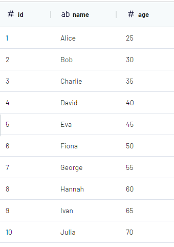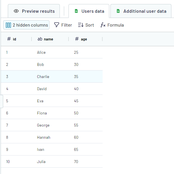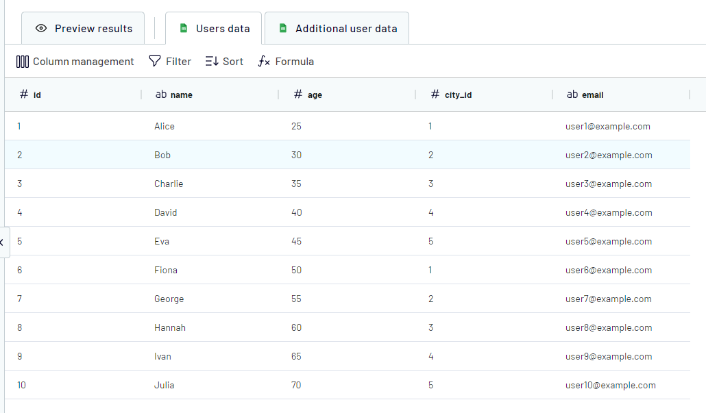 In case "Users data" is chosen as the Key source, we will receive the next result (10 rows as in the key source):