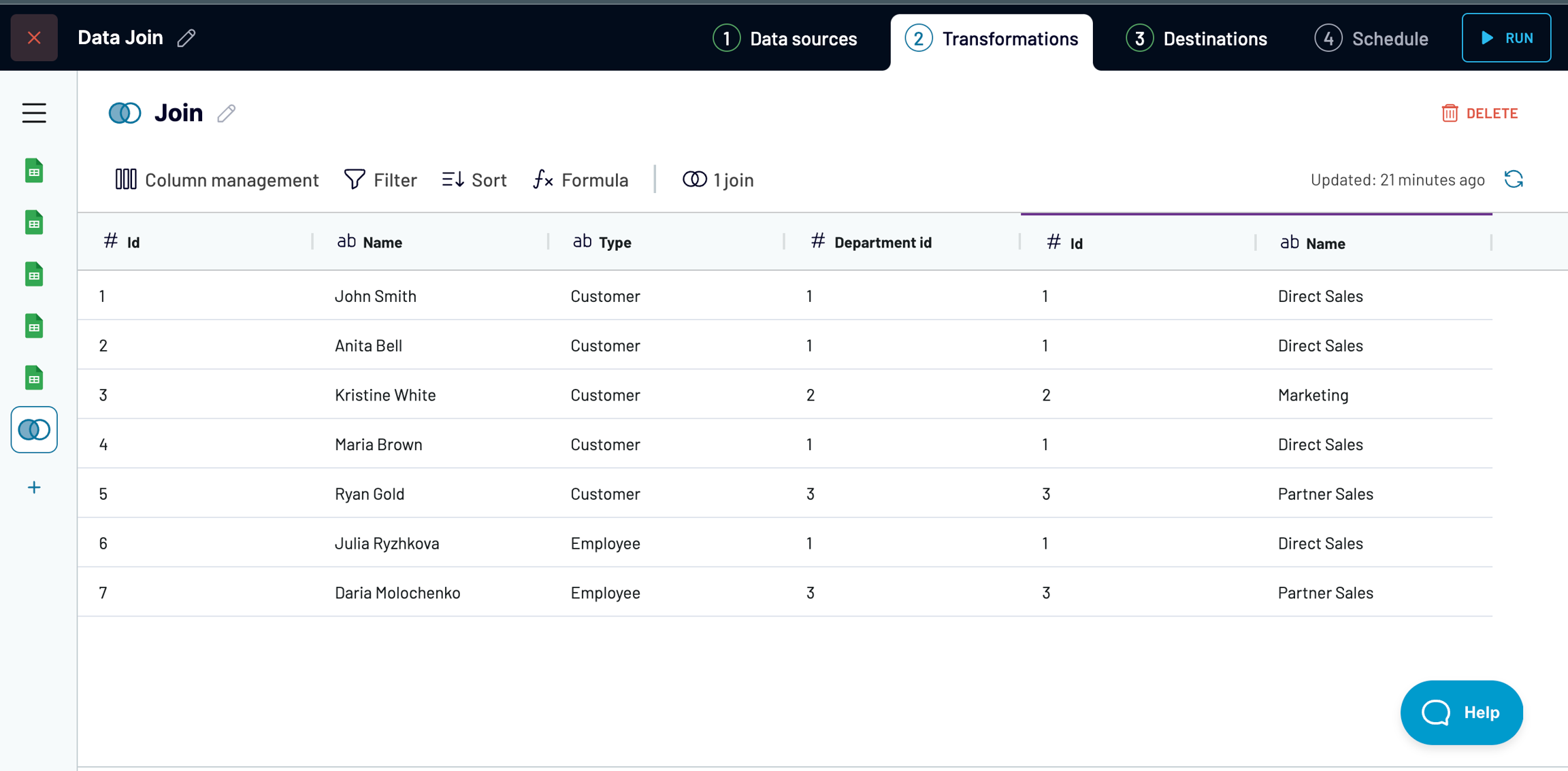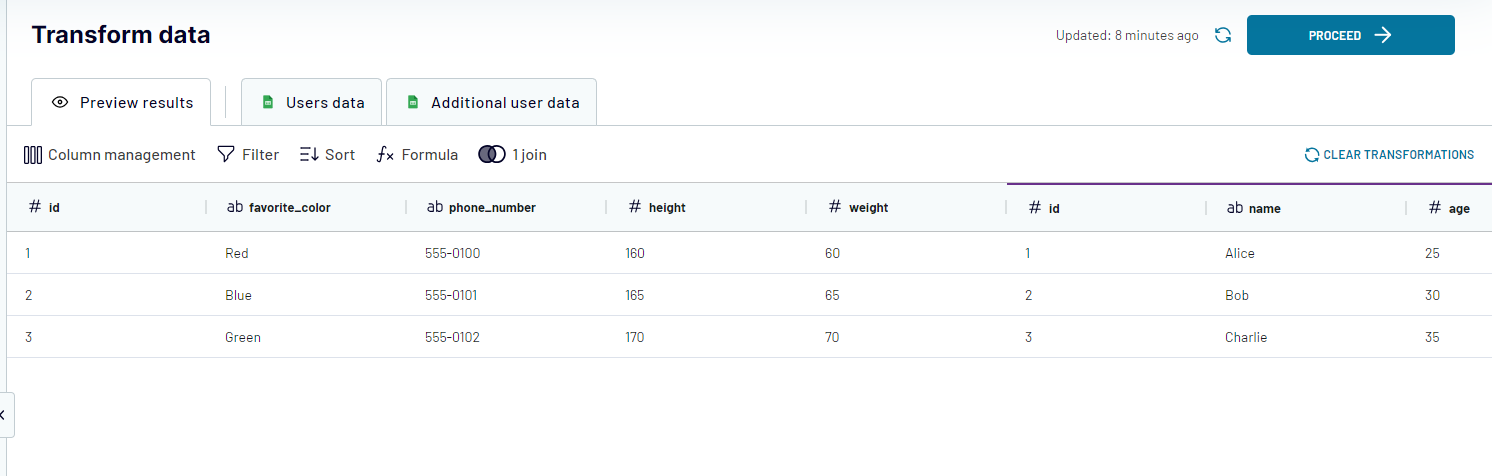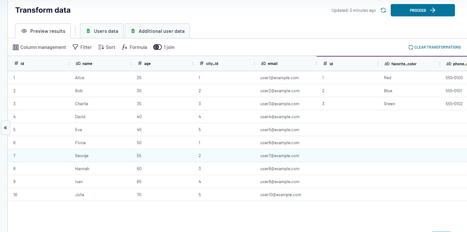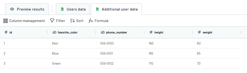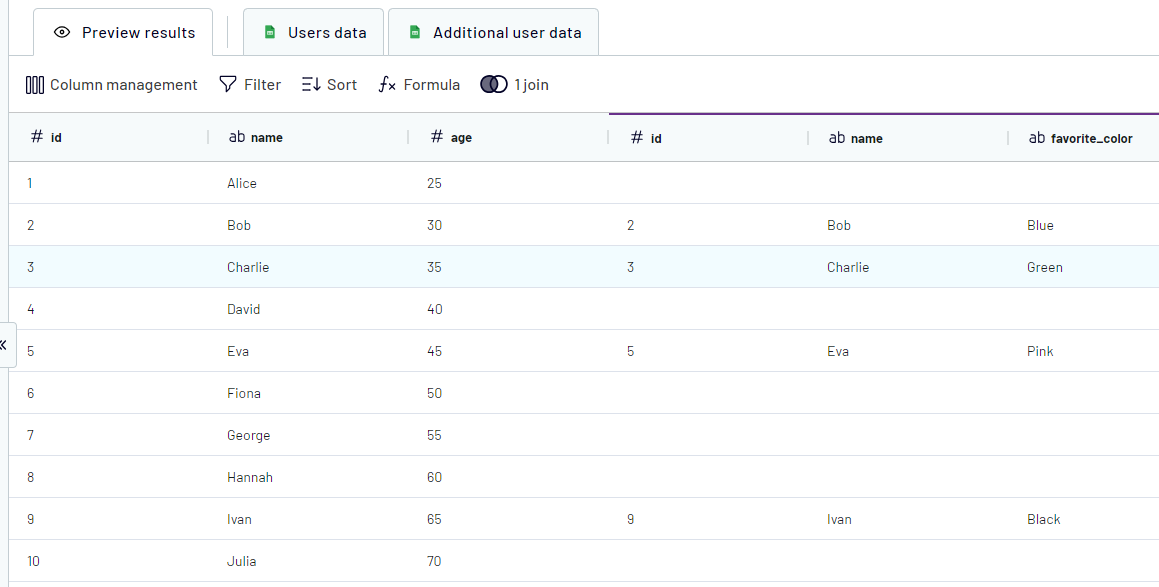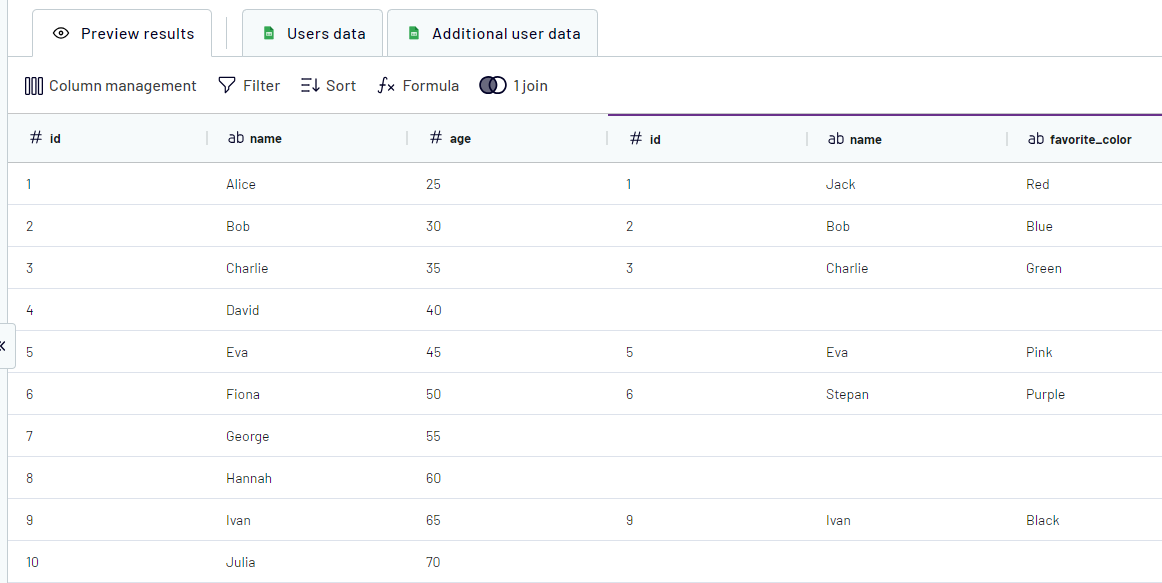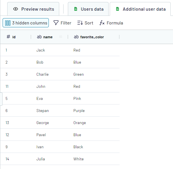 First, let's join these 2 sources by the "Id" field. The result will look like this (part of the data from "Additional user data" was cut due to missing references in the key source):