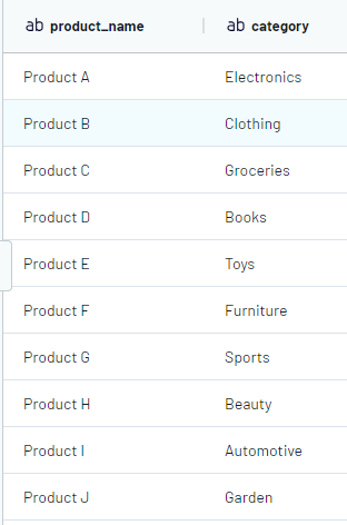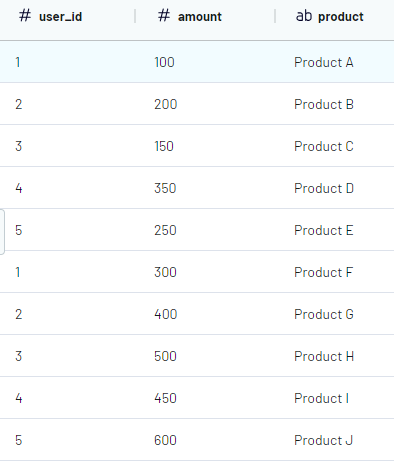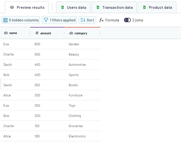 Goal: We wanted to get a list of user names from the "Users" table, the amount of sold products from the "Transaction data" table, and product categories from the "Product data" table.