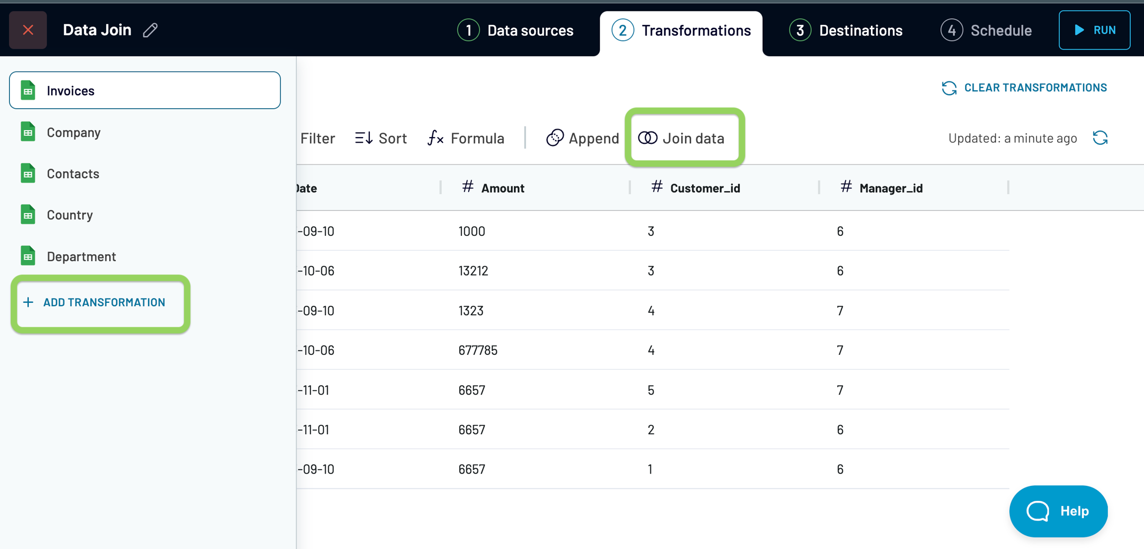 1. After adding the needed sources, go to the "Transformations" step and either select Join data from the data preview window, or hit + Add transformation >> Create Join option from the left sidebar: