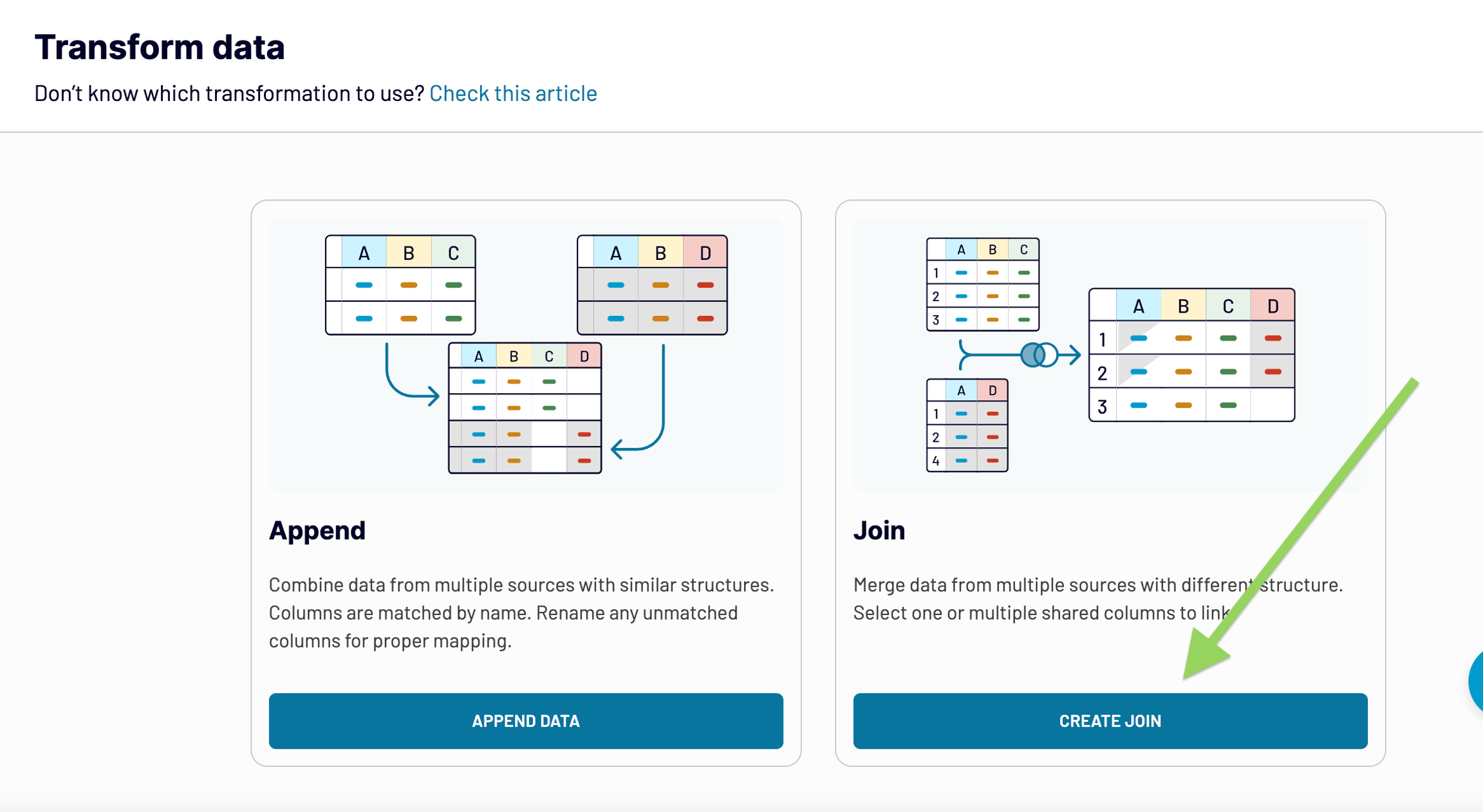 To learn more about APPEND data combining mode, please visit this article: Data Append