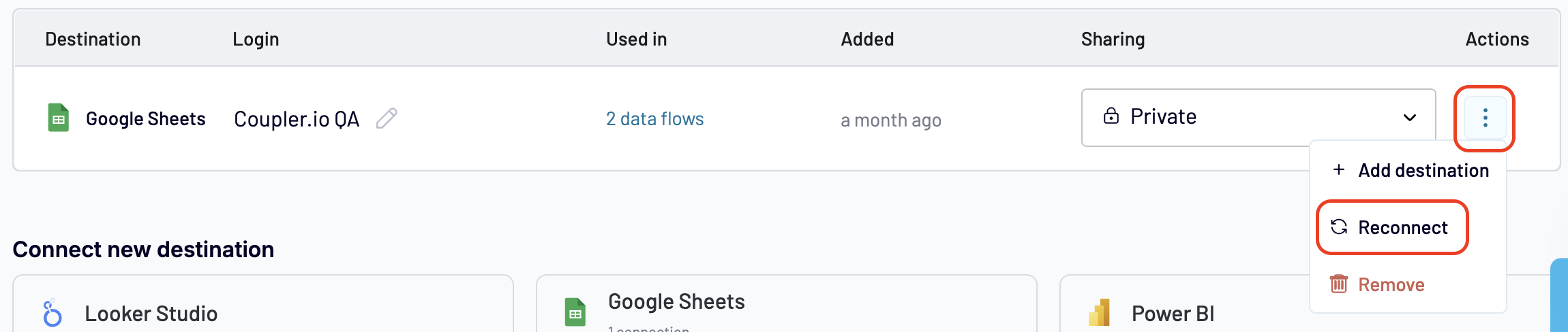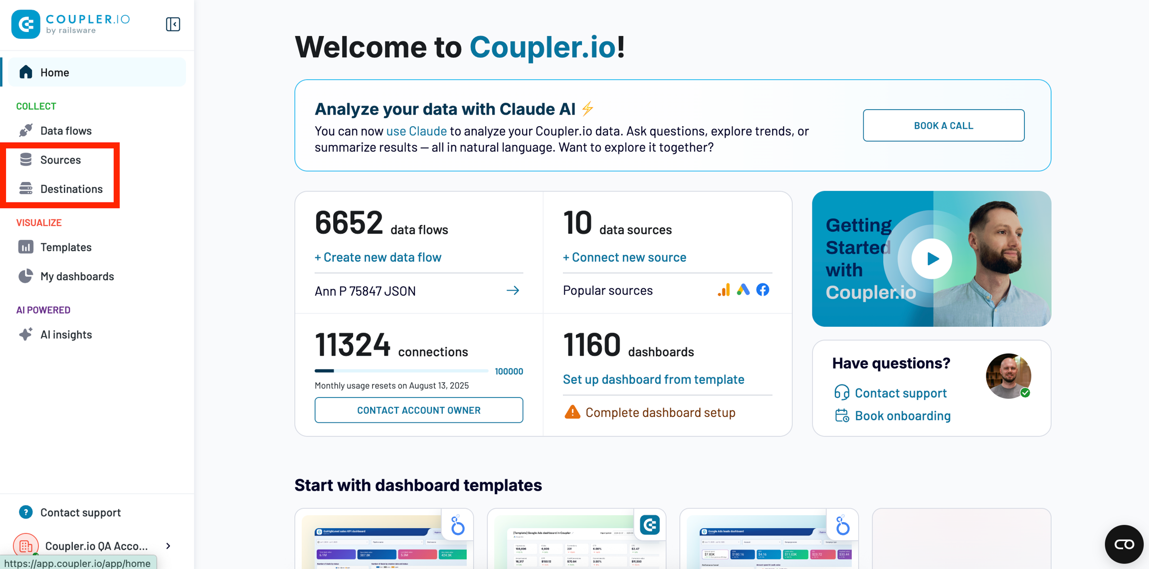 You can also use these links https://app.coupler.io/app/sources and https://app.coupler.io/app/destinations to open the 'Sources' and 'Destinations' section pages respectively.