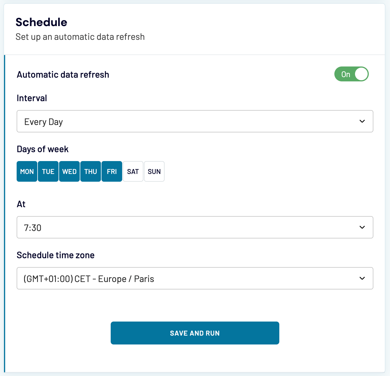 The schedule is fully customizable. You can choose to run the data refresh monthly, weekly, daily, hourly, and even every 15 minutes. Pick the days of the week, choose the time range that works best for your needs, and adjust the timezone should you need to.