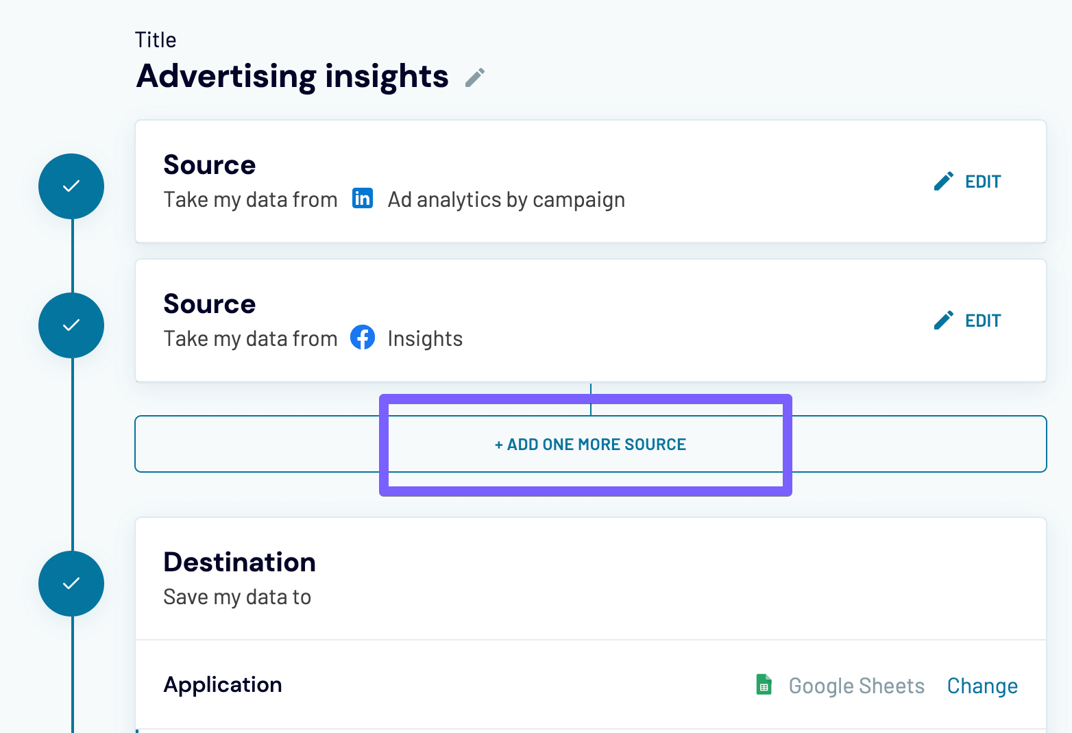 Data stitching is the process of combining data sets from different sources into a single destination. You can fetch data from the same app (e.g. invoices from different QuickBooks entities) or opt for merging data from different apps (e.g. campaign stats from different advertising platforms).