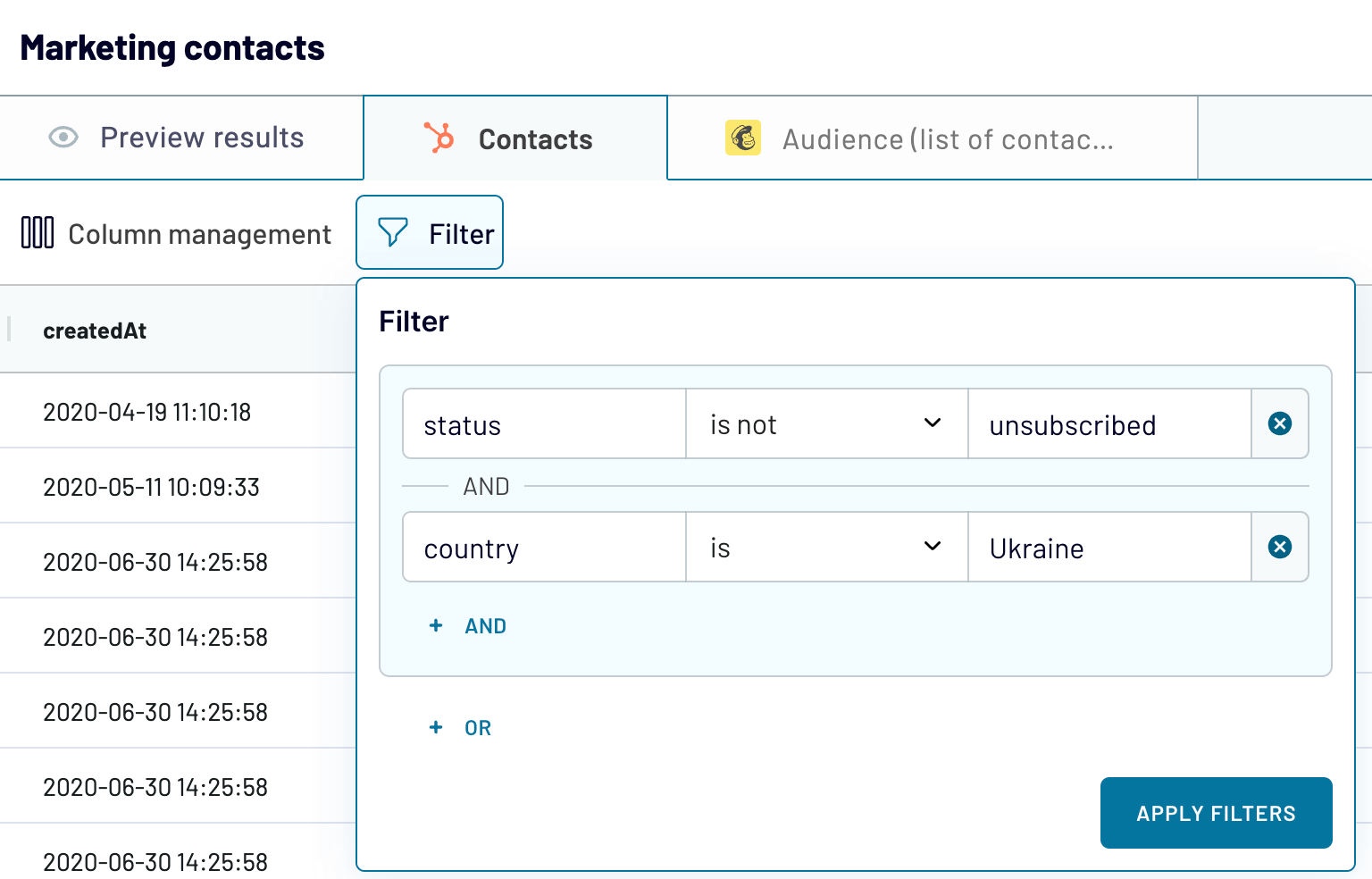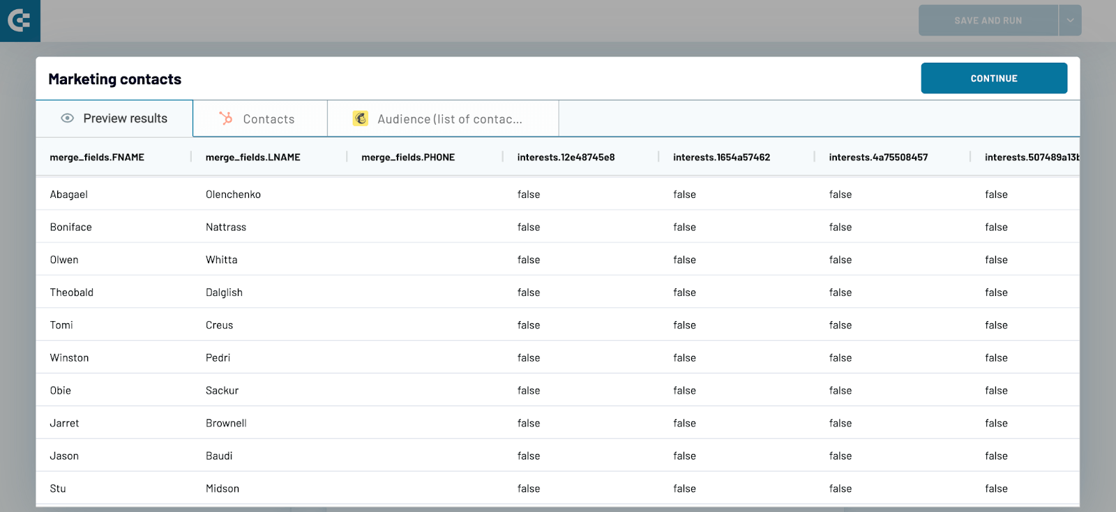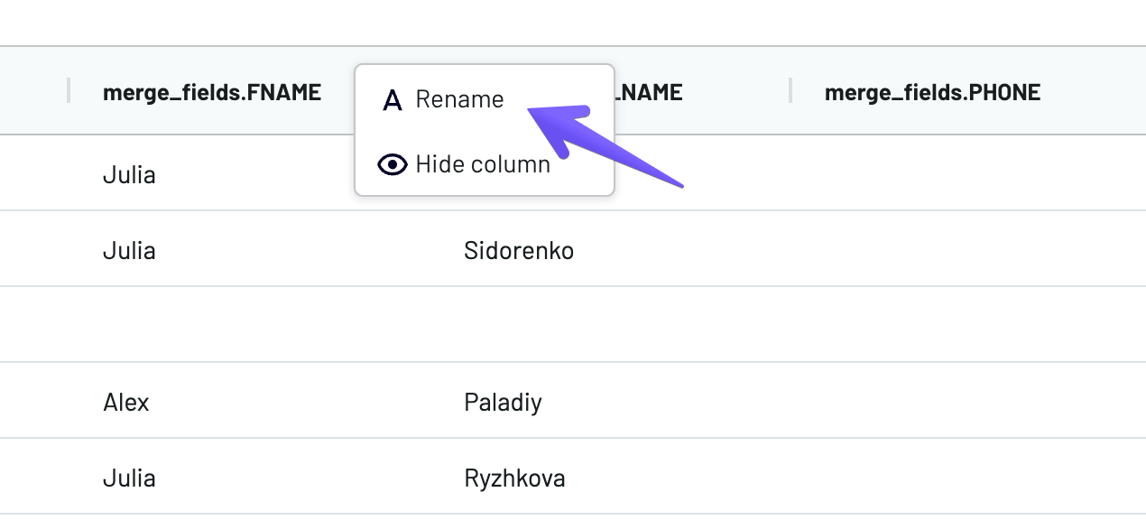 Here, for example, HubSpot uses a clear ‘firstname’ name for the column containing the contact’s first name. Mailchimp, on the other hand, calls an identical field ‘merge_fields.FNAME’. To unify them, open the relevant tab and hover on the problematic column. When it appears, click the hamburger menu and choose Rename. Update the name and apply the changes.