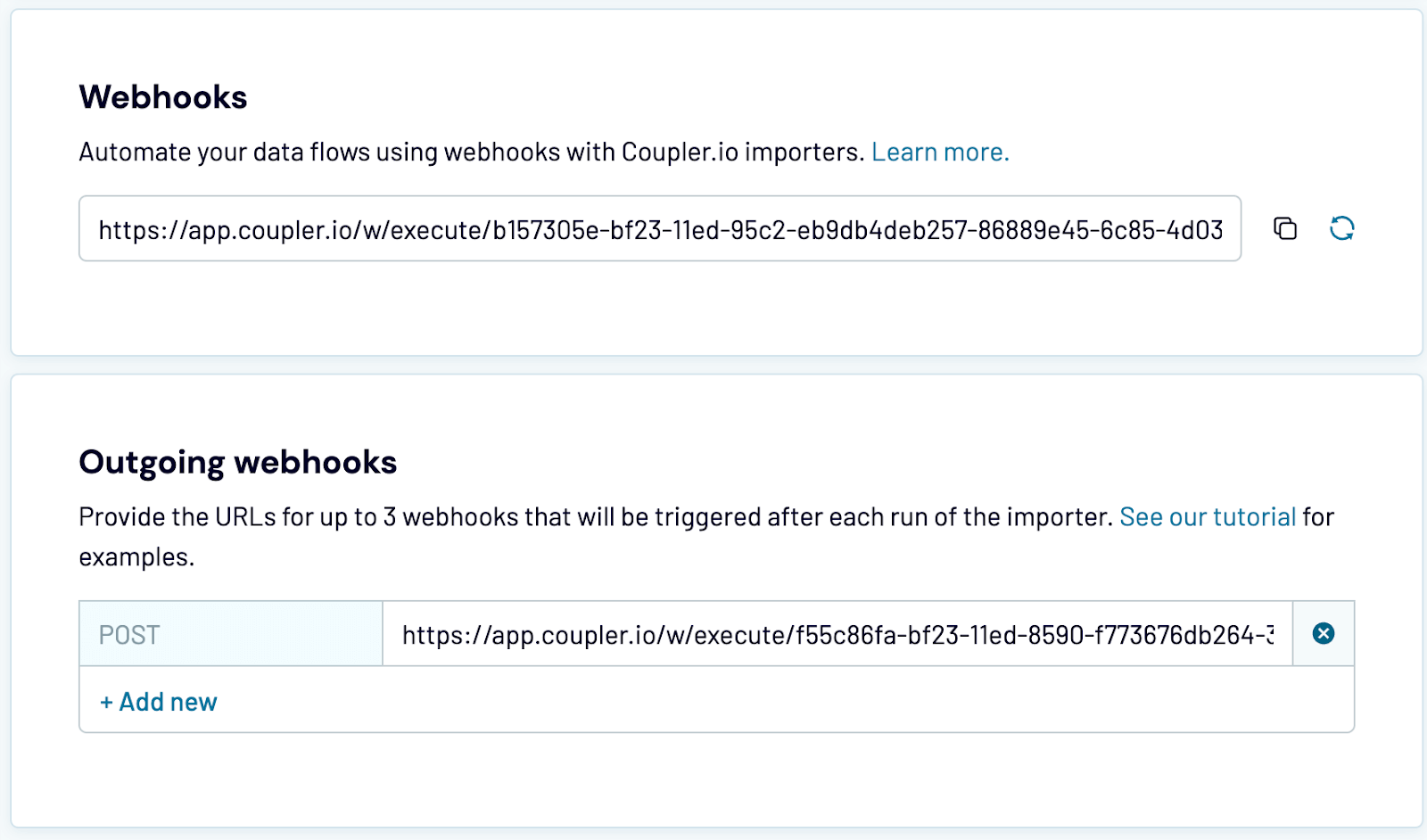 To find the webhooks section, finish an importer setup and run an importer. On the final screen, scroll down to the Webhooks and Outgoing Webhooks sections. You can use the first webhook URL (Webhooks section) to initiate this particular importer. Generate a URL and add it to your API calls or as an outgoing webhook to another importer.