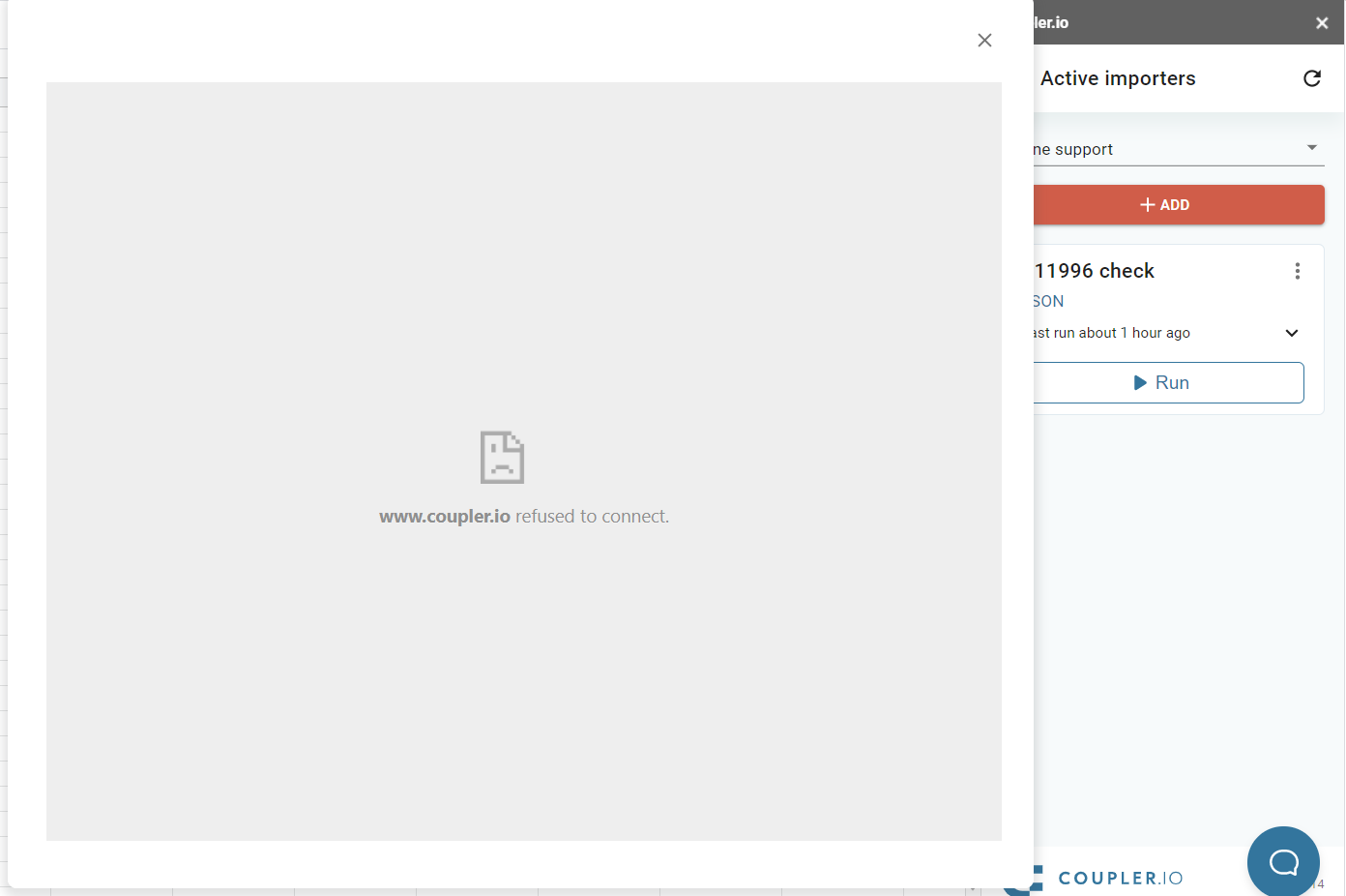 When you are using Coupler.io Add-on and click on the "Add" data flow button or "Edit" data flow button - our Wizard is opened, but shows you the message " www.coupler.ioarrow-up-right refused to connect". This issue can occur using a common browser window or in Incognito mode.