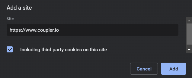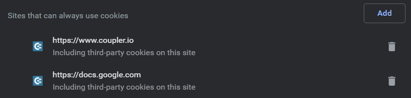 For proper functioning of the Coupler.io Add-on, your browser should allow the use of third-party cookies. To change settings follow the next steps according to the browser you use: