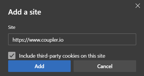 - Leave "Block third-party cookies" enabled, but all Coupler.io to the list of allowed websites: