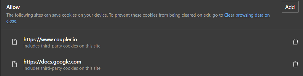 2. Select one of the next options: - Allow all cookies - with this option Coupler.io will work in the common window of your browser and in Incognito mode also. - Block third-party cookies in Incognito - with this option Coupler.io will work in the common window of your browser, but will not work in Incognito mode. - Block third-party cookies - with this option you will block all 3d party cookies, so additional settings are needed for Coupler.io in "Customized behaviors" section: -- Scroll to the "Sites that can always use cookies" list.-- Click "Add". -- Paste " https://www.coupler.io"arrow-up-right. -- Check "Including third-party cookies on this site". -- Click "Add".-- Click "Add". -- Paste "https://docs.google.comarrow-up-right". -- Check "Including third-party cookies on this site". -- Click "Add".As result you should have next settings:Allowance for https://www.coupler.ioarrow-up-right is needed to allow web version work. Allowance of https://docs.google.comarrow-up-right is needed to allow addon work in Google Spreadsheets.