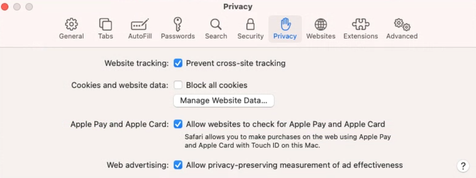 1. Go to Safari -> Preferences -> Privacy.